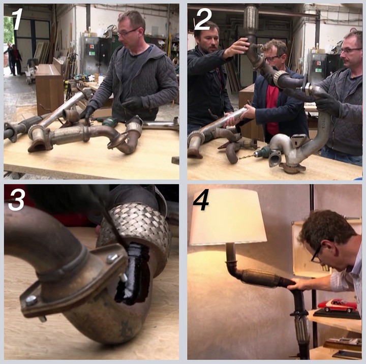 Postup je pomerne jednoduchý a dokonca nemusíte používať ani zváračku. Jednotlivé výfuky pospájajte skrutkami, pričom si môžete pomôcť vŕtačkou. Pletence preleštite a hrdzavé rúrky ošetrite ochrannou farbou. „Hrdzu ošetríme takou fintičkou. Máme na to vymyslenú takú vec. Je ňou farba na kožu na báze liehu. Hrdzavé železo po natretí touto farbou vyzerá veľmi dobre. Bude to na tom dobre držať, lebo lieh sa odparí a ostane na tom matný lak,“ povedal zručný Martin. Do kostry lampy následne zavedieme elektroinštaláciu a na vrch umiestnime tienidlo. Skutočne originálnu lampu si s trochou šikovnosti vyrobíte za 1 až dva dni a stáť vás bude približne 70 eur.