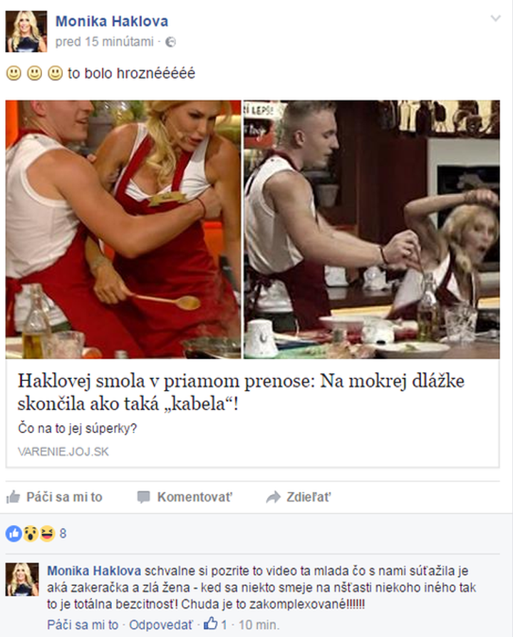 Monika Haklová si servítku pred ústa nedáva. Svoje by o tom vedeli povedať mnohé známe tváre, ktoré spovedala ako „zúrivá reportérka“. Preto vás možno už ani nezaskočia jej slová, ktoré adresovala súperke z relácie Moja mama varí lepšie ako tvoja. Moniku zrejme nahnevala reakcia súperky, ktorá sa rozosmiala na jej nepríjemnom páde. Na svojej stránke na Facebooku zdieľala článok z webu JOJ.SK, pod ktorý pridala nelichotivý komentár: „Schválne si pozrite to vide. Tá mladá, čo s nami súťažila, je aká zákeráčka a zlá žena – keď sa niekto smeje na nešťastí niekoho iného, tak to je totálna bezcitnosť! Chúďa je to zakomplexované!!!“