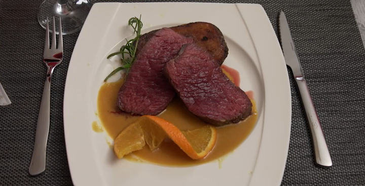 Mäso si opracuje do formy steakov a posolíme, pokoreníme trojfarebným korením. Opečieme sprudka z každej strany a zabalíme do alobalu. Na panvici si rozpustíme cukor a spravíme karamel, pridáme whisky, pomarančovú šťavu, pomaranče a čili. Povaríme. Zemiaky si uvaríme v šupke. Rozkrojíme na polovice. Zemiaky opekáme na rozpálenej panvici a potierame zmesou zo soli, čierneho korenia a korenia na americké zemiaky.