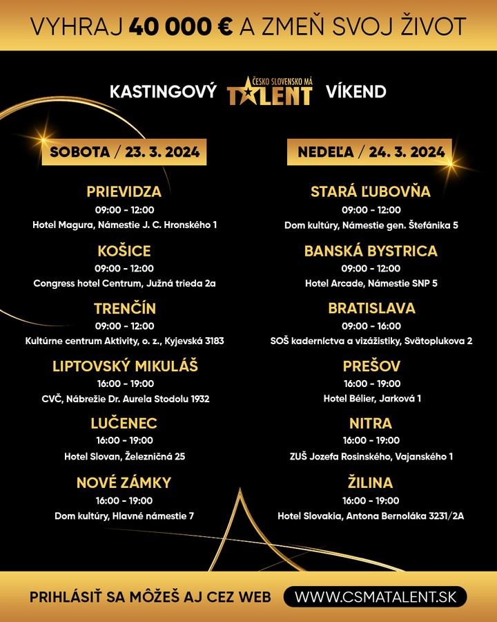 Zmeňte svoj život od základov. Zabojujte tiež o lákavú výhru 40 000 €. Už budúci víkend sa môžete prísť ukázať do viacerých miest naprieč Slovenskom. Využite túto jedinečnú šancu. Zažijete jedinečnú atmosféru, predvediete vaše nadanie a odídete navyše bohatší nielen o nové zážitky a skúsenosti, ale aj možnosť, že váš život sa bude uberať novým, iným smerom. A kedy a kam?