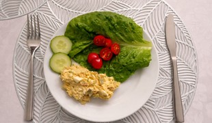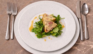 Májový šalát s droždovo-orieškovým krekerom a špargľovou penou
