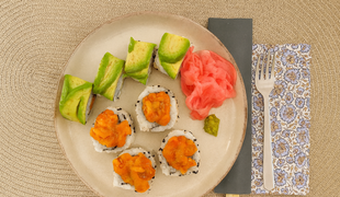 HLAVNÉ JEDLO - Uramaki plnené krevetou, mangom, uhorkou a zdobené avokádom